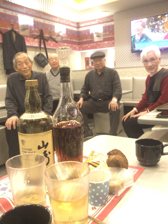 世話人さんから高級ブランディ―とウイスキーを頂き、会員さんからもあれこれ差し入れを頂きました。開会にあたって、先ずは乾杯・・・!! 少し紅潮した顔で、好調なスタートです。